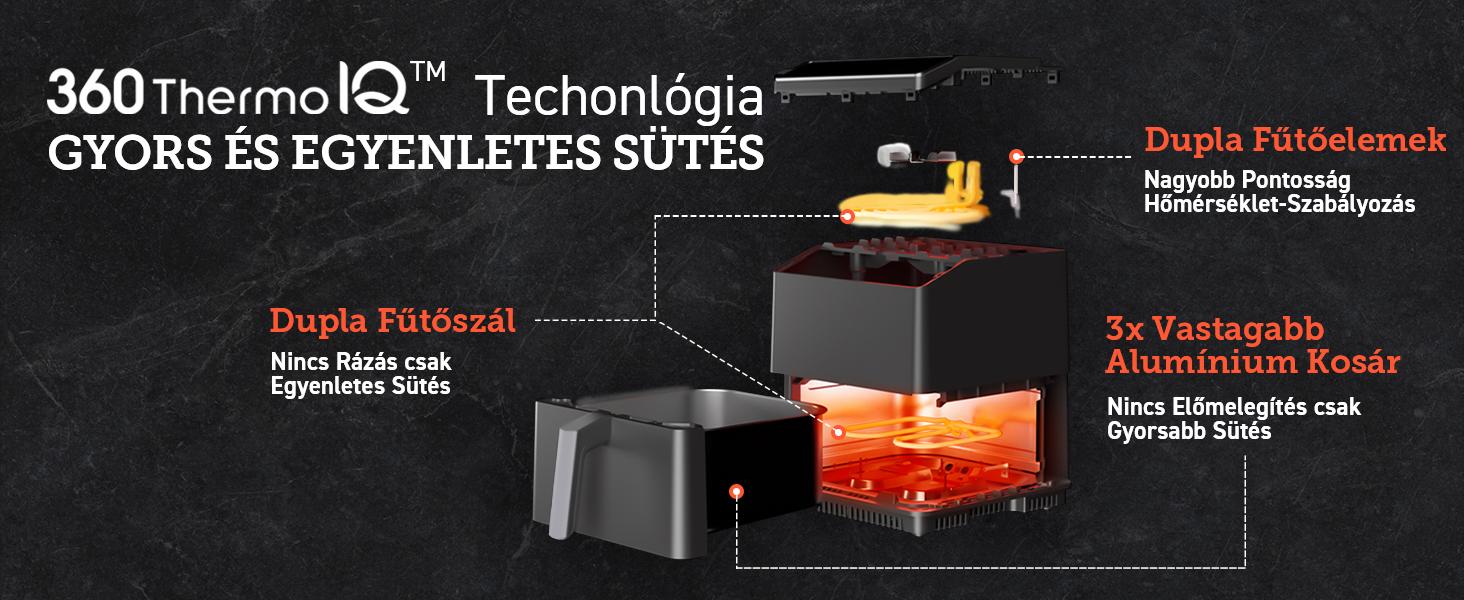A „360” a meleg levegő körkörös, teljes lefedettséget biztosító keringetésére utal. A ThermoIQ® intelligens vezérlőrendszer pedig automatikusan optimalizálja a fűtőelemek működését és a légáramlást, hogy az étel ne csak kívül legyen ropogós, hanem belül is tökéletes állagú maradjon – legyen szó sült burgonyáról, csirkéről vagy péksüteményről.