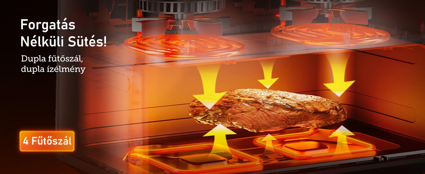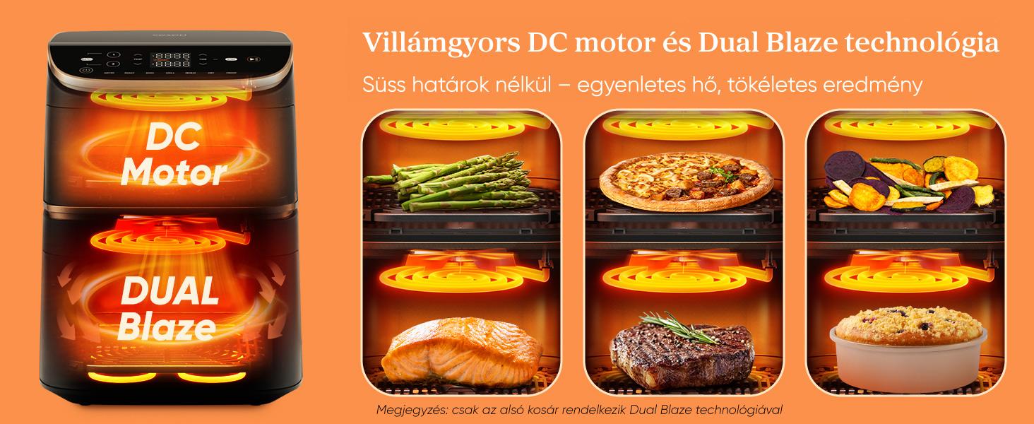 A Cosori az elsők között alkalmazta a kettős fűtőszálas technológiát a forrólevegős sütők piacán, amit hivatalosan Dual Blaze™ technológiának neveznek. Ez a rendszer egyidejű alsó és felső fűtést biztosít, amely révén az étel mindkét oldala egyszerre és egyenletesen sül meg. A Dual Blaze technológia egyik fő előnye, hogy nem szükséges az ételt rázni vagy forgatni sütés közben, így a használat kényelmesebb, gyorsabb és pontosabb eredményt ad. Ehhez kapcsolódik a 360 ThermoIQ™ intelligens hőmérséklet-szabályozás, amely valós időben figyeli a sütő belső hőmérsékletét, és a hőingadozást 3 °C alatt tartja. Ennek köszönhetően a sütési hőmérséklet mindig stabil, és az étel nem lesz sem túlsütve, sem nyers marad.